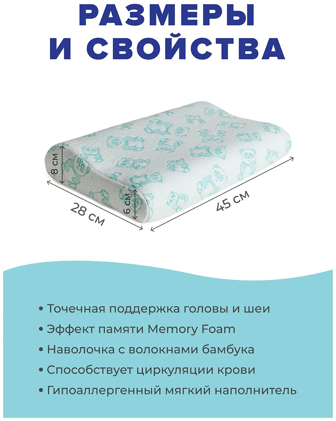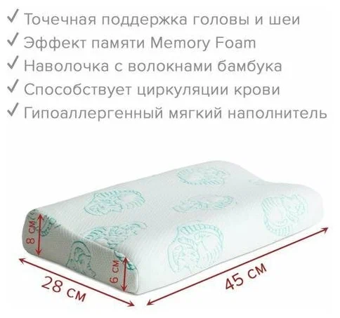 Ambesonne подушка анатомическая с эффектом памяти Memory Foam чехол бамбук 45х28 - произведена по уникальной технологии с использованием Memory foam - пены с эффектом мгновенной памяти. Во время сна мышцы эффективно расслабляются, благодаря точечной поддержке головы и шеи. Подушка принимает индивидуальную для каждого человека форму и дает возможность полностью восстановить кровоснабжение верхнего отдела позвоночника. Трикотажный снимаемый чехол изготовлен из бамбукового волокна, которое обладает высокой гигроскопичностью и антимикробными качествами. Подушка служит без потери свойств длительное время, всегда оставаясь в первоначальном виде и не утрачивая форму. Основные отличия анатомической подушки: наполнитель последнего поколения с эффектом Memory foam средняя жесткость, которая наиболее привлекательна и подойдет всем гипоаллергенный состав нейтрален и не вызывает раздражения подшейный валик эргономичный и физиологически грамотно поддерживает голову и шею подушка подойдет взрослым и детям с трех лет