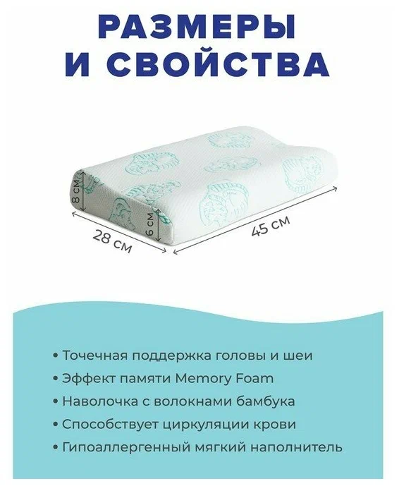 Ambesonne подушка анатомическая с эффектом памяти Memory Foam чехол бамбук 45х28 - произведена по уникальной технологии с использованием Memory foam - пены с эффектом мгновенной памяти. Во время сна мышцы эффективно расслабляются, благодаря точечной поддержке головы и шеи. Подушка принимает индивидуальную для каждого человека форму и дает возможность полностью восстановить кровоснабжение верхнего отдела позвоночника. Трикотажный снимаемый чехол изготовлен из бамбукового волокна, которое обладает высокой гигроскопичностью и антимикробными качествами. Подушка служит без потери свойств длительное время, всегда оставаясь в первоначальном виде и не утрачивая форму. Основные отличия анатомической подушки: наполнитель последнего поколения с эффектом Memory foam средняя жесткость, которая наиболее привлекательна и подойдет всем гипоаллергенный состав нейтрален и не вызывает раздражения подшейный валик эргономичный и физиологически грамотно поддерживает голову и шею подушка подойдет взрослым и детям с трех лет