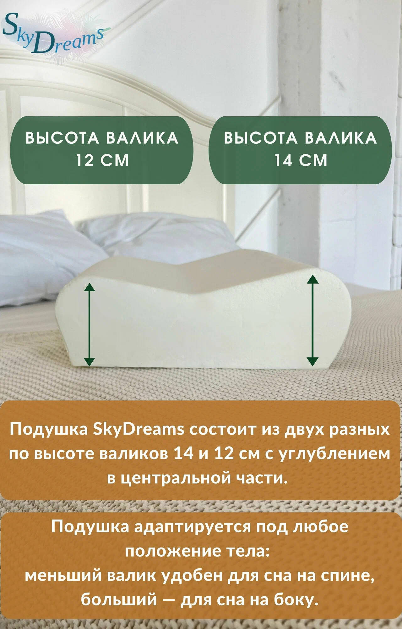 Два валика на подушке помогут правильно расположить шею и спину во время сна, предотвращая возможные боли и напряжение.