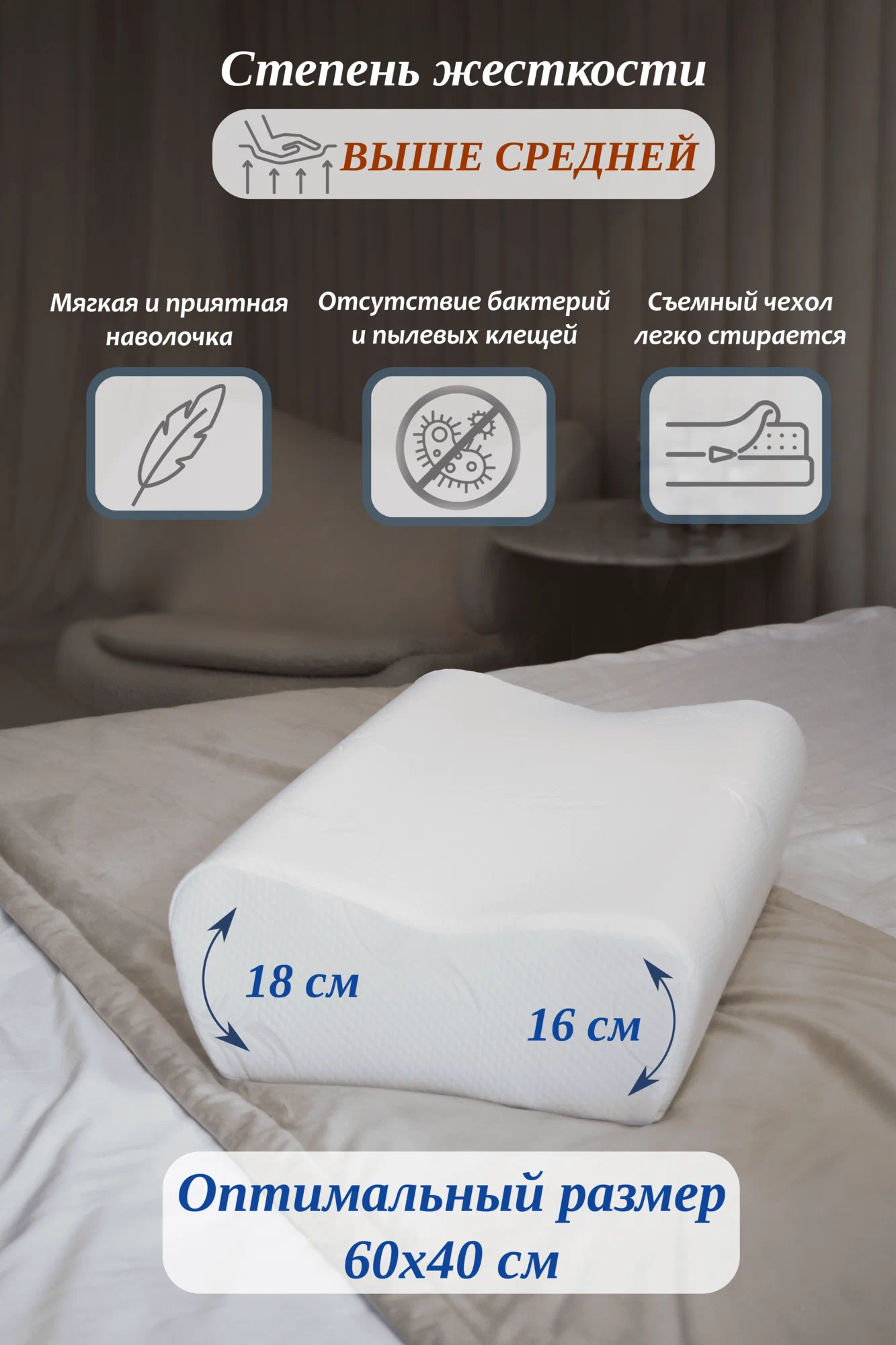 Анатомическая форма с валиками делает акцент на поддержку шеи. Эффект памяти помогает распределить давление и сделать опору более ровной. Высота 18 см — ключевой параметр: подбирайте под ширину плеч и любимую позу. Оптимальные сценарии — сон на боку/спине. Для лучшего результата сочетайте с подходящим матрасом и привычной наволочкой.