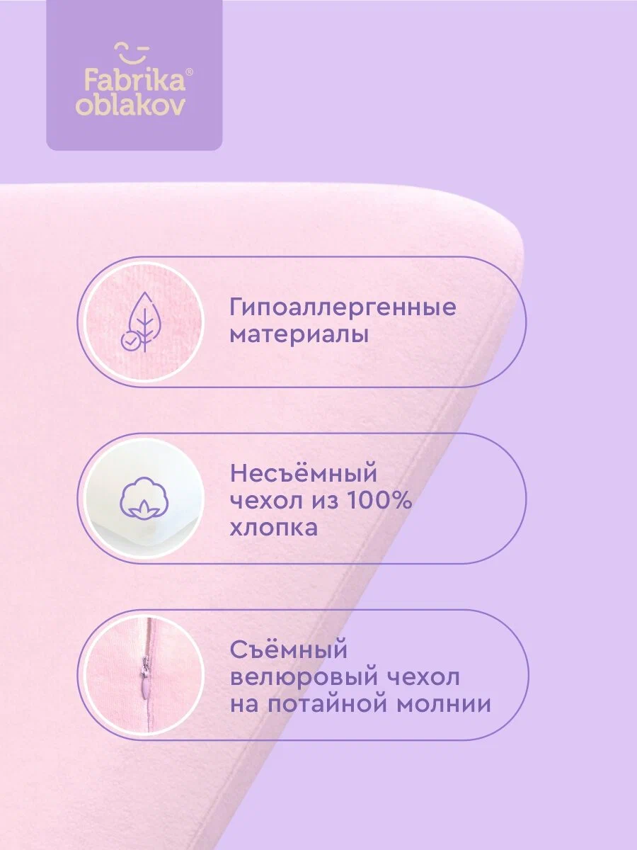 Наволочка подушки съемная, на молнии, изготовлена из хлопка с небольшим ворсом. Она подарит комфортные условия сна для ребенка, а при необходимости ее можно постирать.
