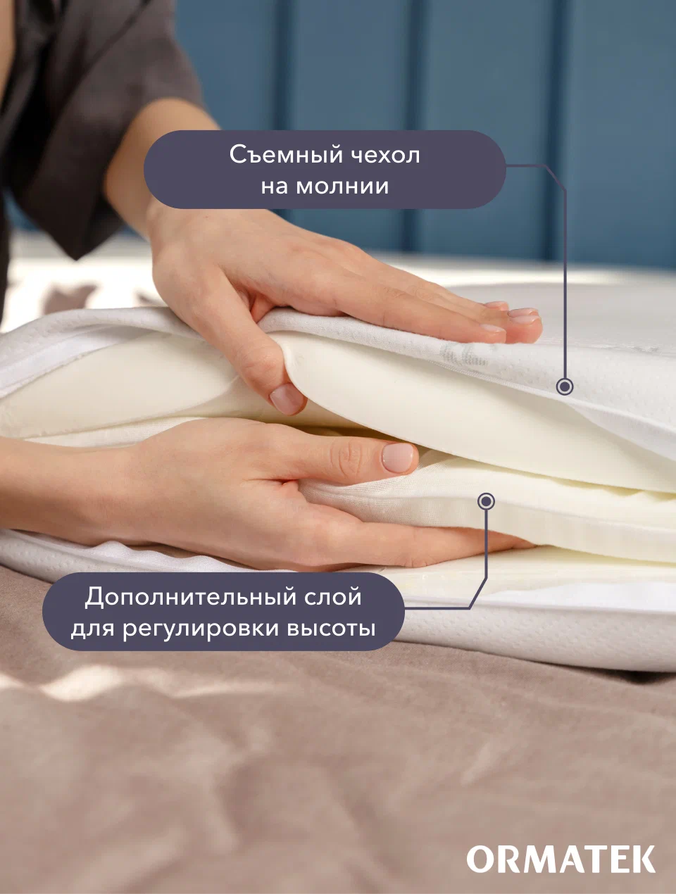 Внешний чехол подушки выполнен из нежного трикотажа и поддерживает естественную циркуляцию воздуха. Чехол не требует сложного ухода, его можно снять и постирать, благодаря чему с ним легко поддерживать свежесть и чистоту спального места.