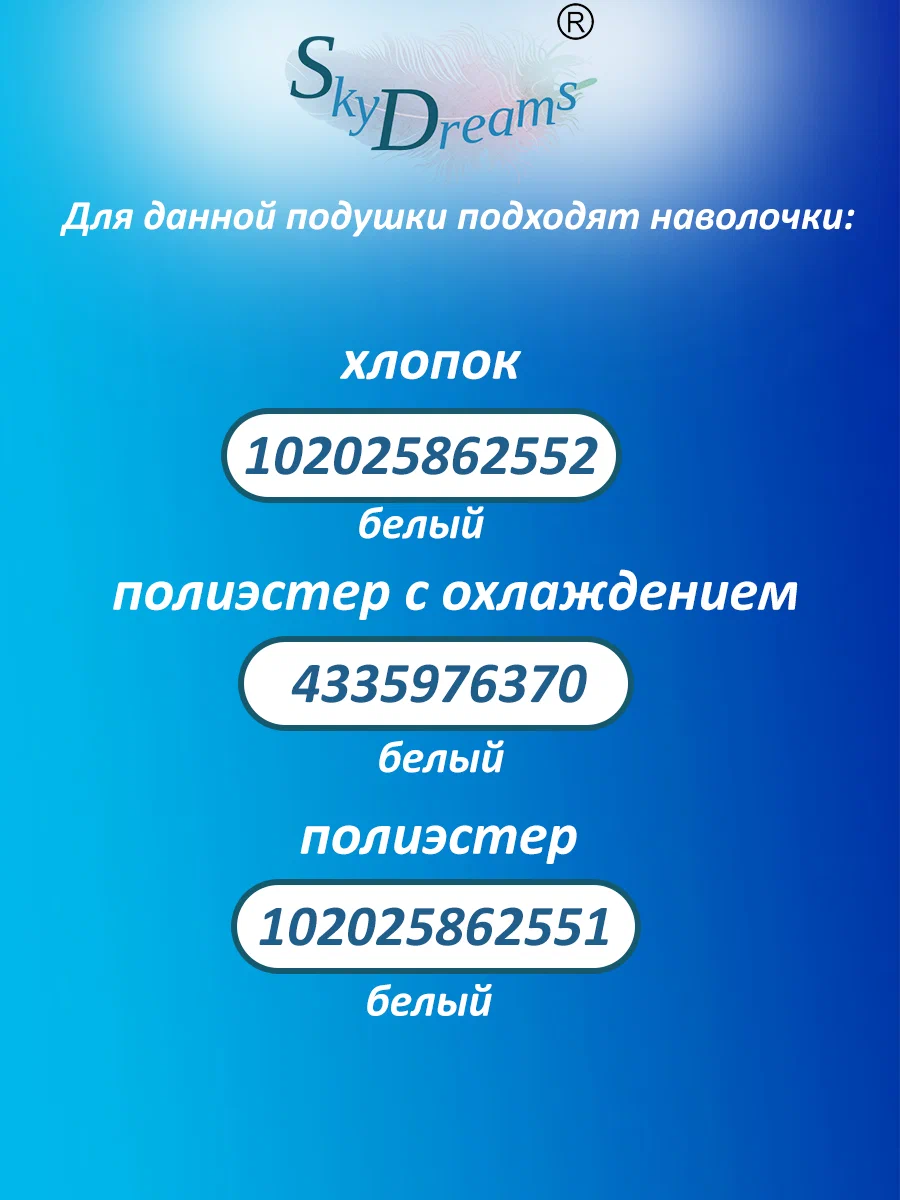 Наволочки, подходящие для данной подушки: 102025862552 (хлопок), 102025862551 (полиэстер), 4335976370 (полиэстер с охлаждающими нитями)