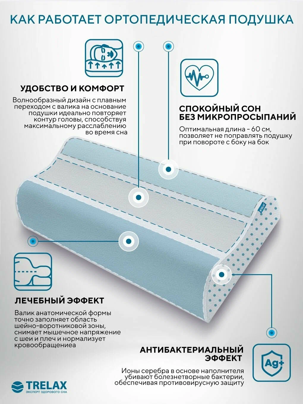 обладает антибактериальным эффектом благодаря ионам серебра в основе подушки;