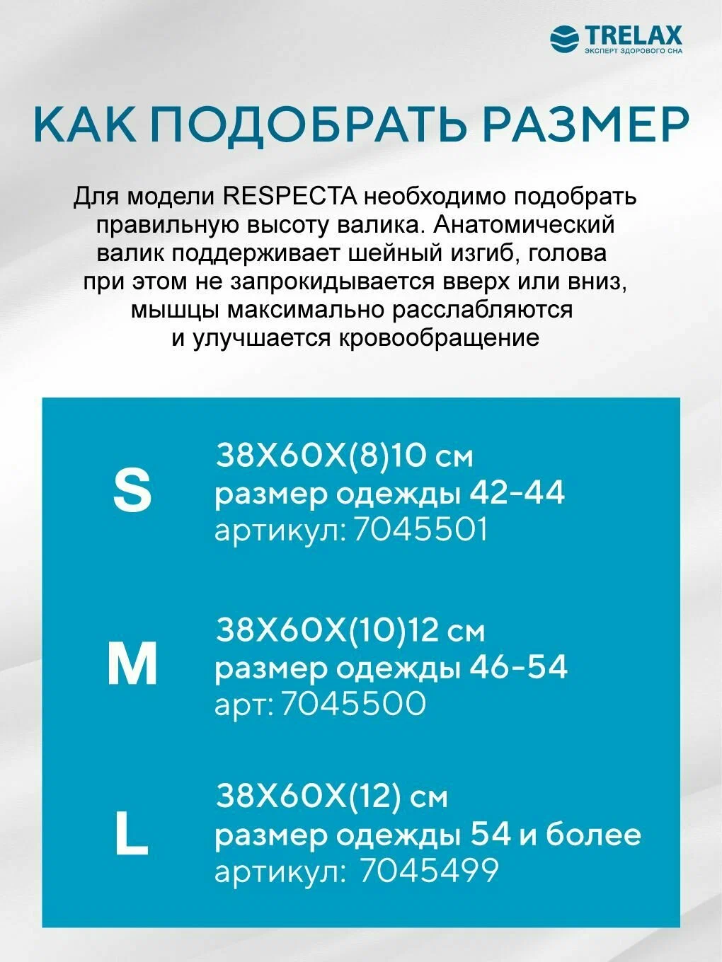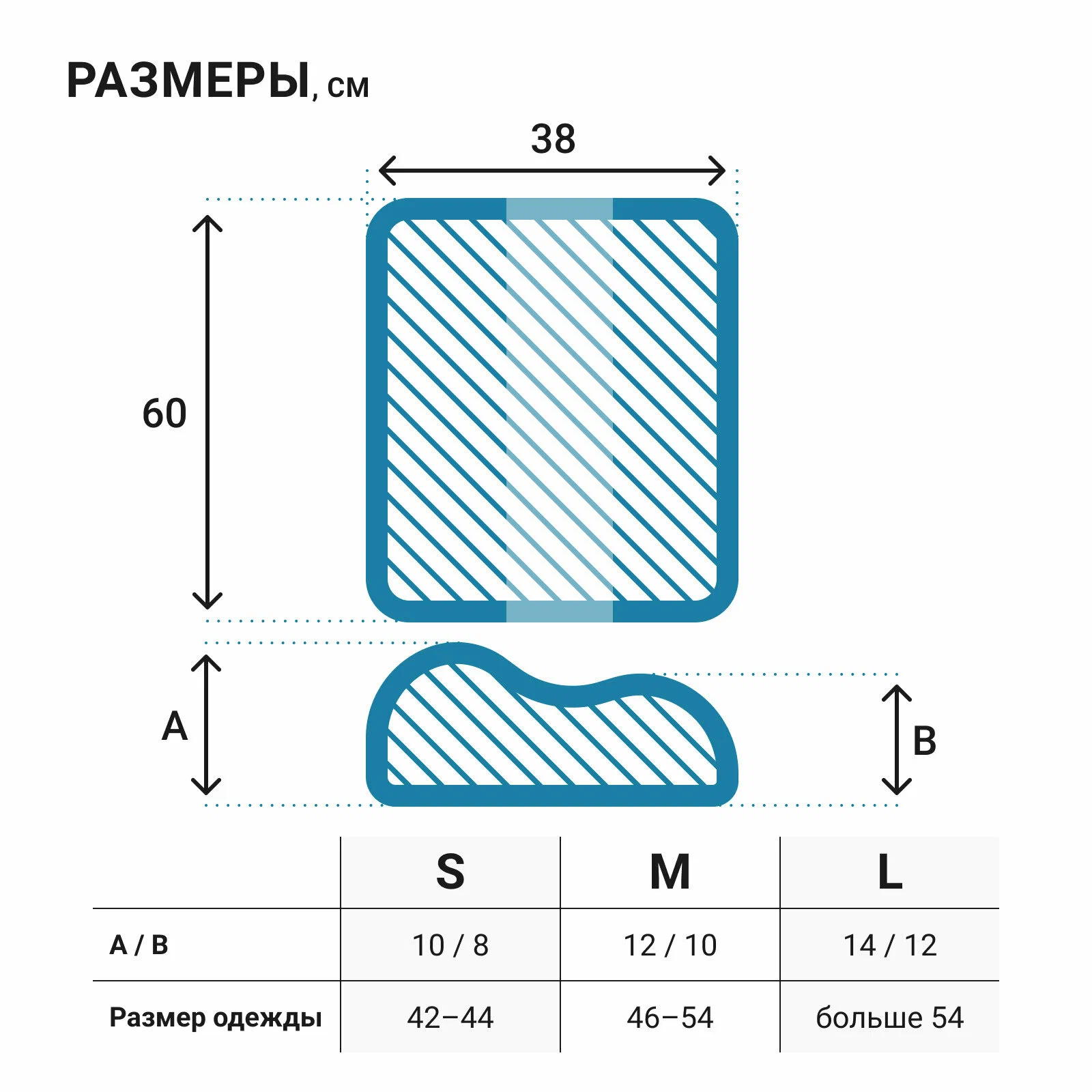 • размер одежды более 54: размер подушки L (38x60x(12)14 см).