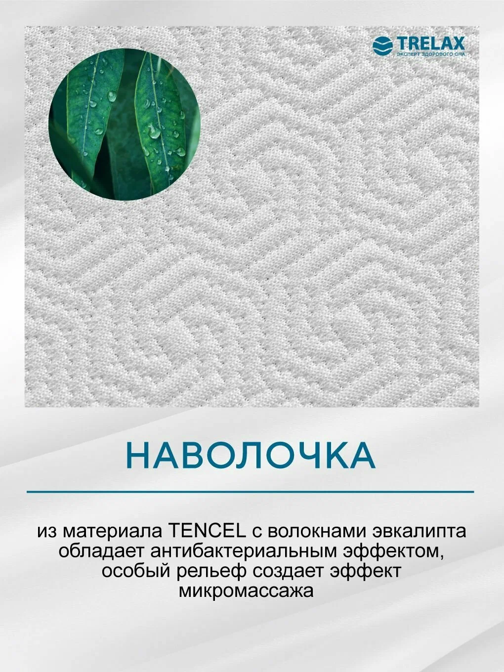 наволочка из ткани Tencel — австралийского волокнистого волокна — мягкая и приятная на ощупь, отлично пропускает воздух и препятствует росту бактерий;