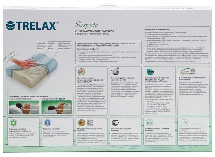 В структуру основы подушки пенополиуритана добавлены ионы серебра, которые обеспечивают антибактериальный эффект. Наволочка подушки выполнена из ткани с волокнами TENCEL, гипоаллергенного материала, препятствующего росту бактерий, мягкого и приятного на ощупь. Эффективность RESPACTA доказана клиническими испытаниями.