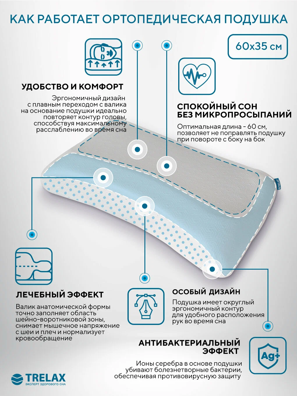 Trelax Solo S — удобная ортопедическая подушка для сна на боку и спине с эффектом памяти формы и ионами серебра. Один валик лунообразной формы и специальная выемка под плечо помогают правильно расположить шею и голову, сохранить естественные изгибы позвоночника и снизить нагрузку на мышцы во время сна.
